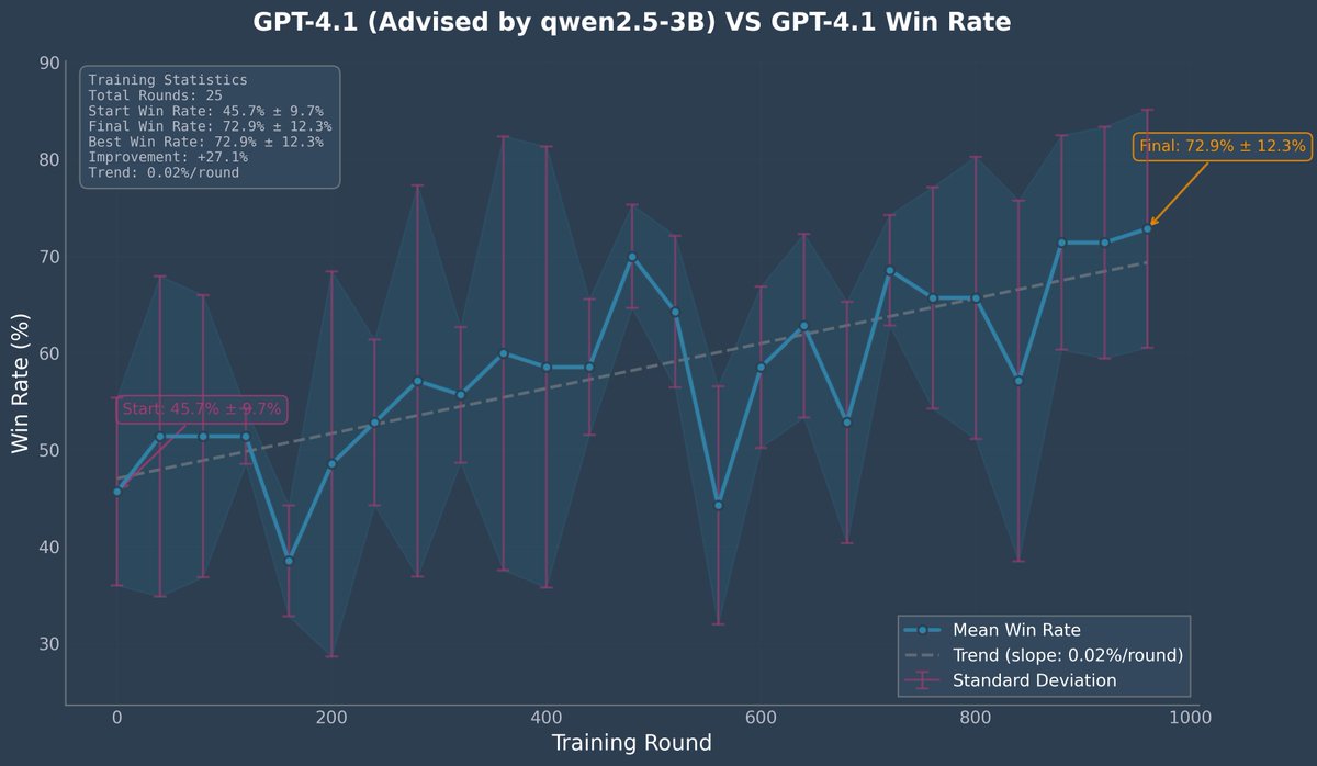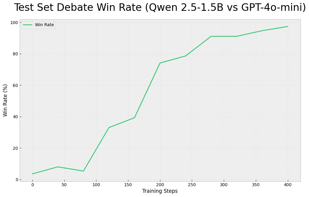 code available here with the dataset: i do think its interesting that a 1.5B model couldnt ever win - whether the judge was itself or gpt-4o-minigithub.com/brendanhogan/D…
