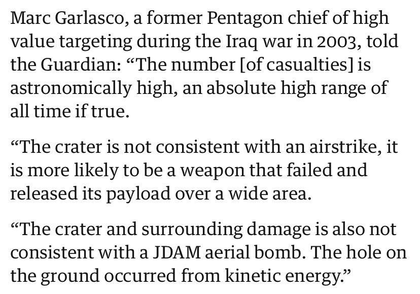 2/10 The Guardianās investigation claims itās based on a āforensic reviewingā of āopen source informationā. Thereās little evidence of this. Rather the investigation hinged on a single interview of widely discredited former pentagon official and defence contract Marc Garlasco. Garlasco has no academic credentials as a weapons expert. In the Guardian he claims āthe crater is not consistent with an airstrikeā which is what the Guardianās conclusion relies on