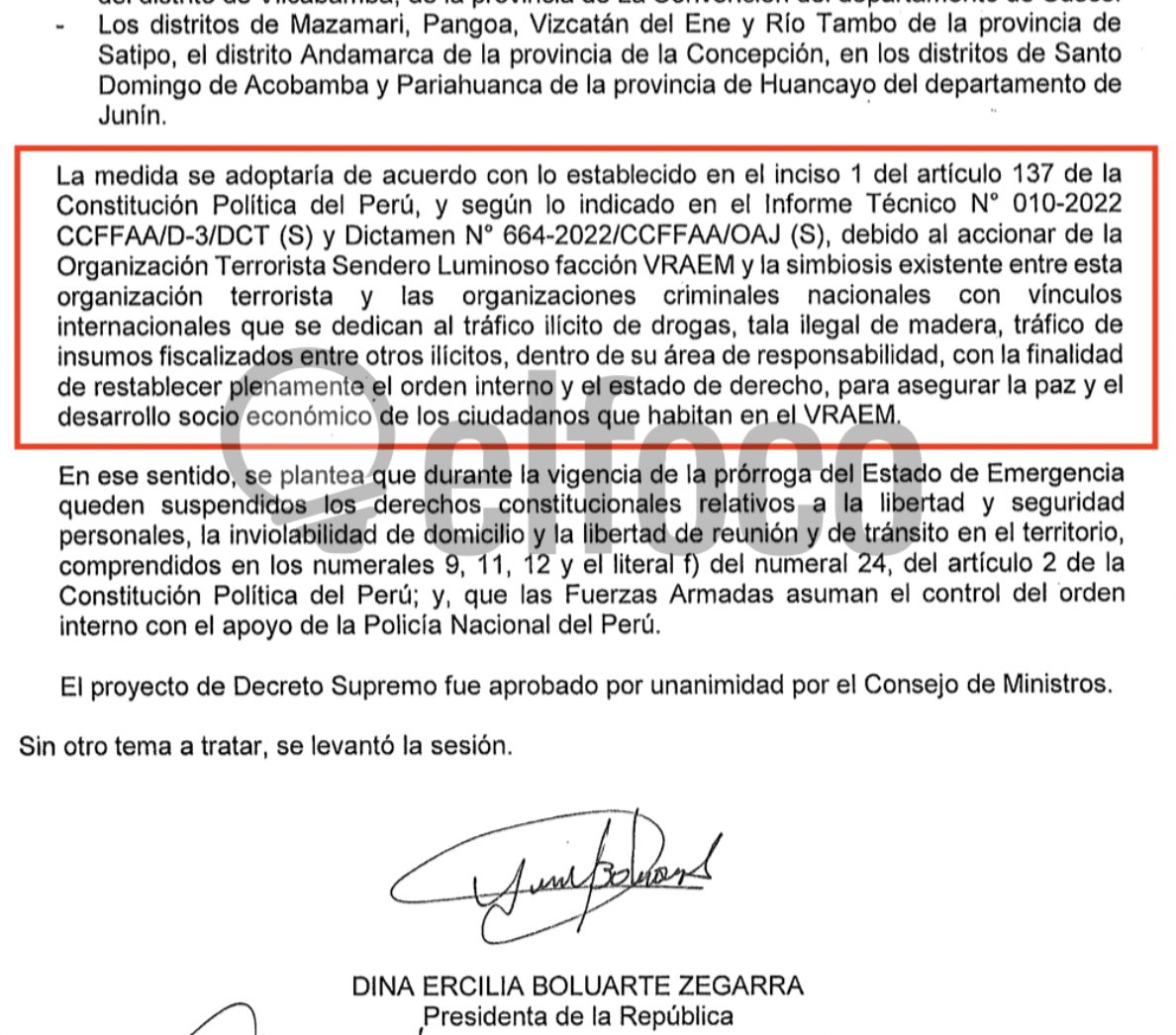 “La medida se adoptaría (...) debido al accionar de la Organización Terrorista Sendero Luminoso facción VRAEM y la simbiosis existente entre esta organización terrorista y las organizaciones criminales nacionales...", se lee en el acta del pasado 12 de diciembre.