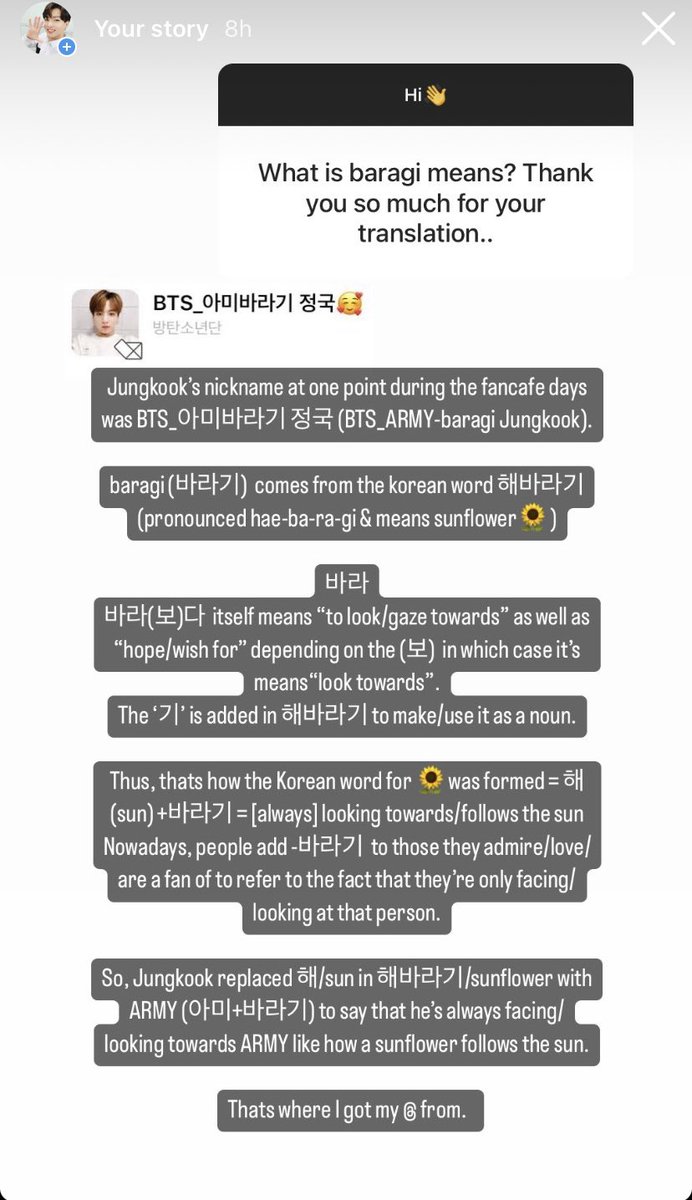 baragi(바라기) comes from the korean word 해바라기 (pronounced hae-ba-ra-gi & means sunflower🌻)