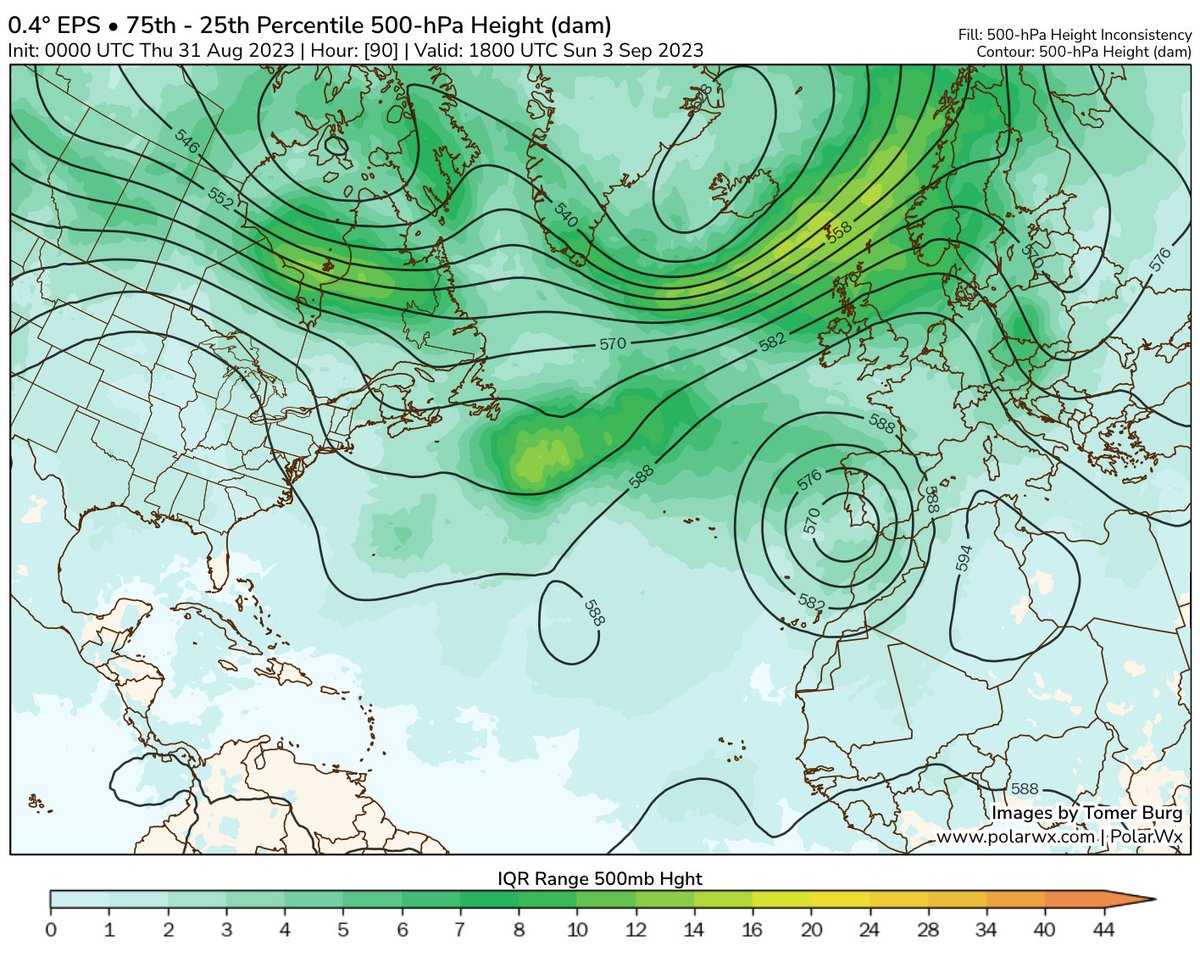 The biggest source of synoptic-scale uncertainty is where an anomalously deep upper-level low will track, as the farther west it cuts off and stalls off Spain/Portugal, the warmer sea surface temperatures are where an eventual surface cyclone will develop.
