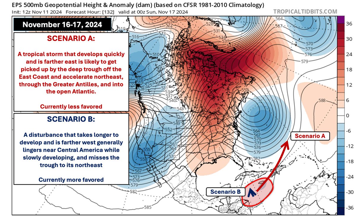 There is still the possibility a storm doesn't develop. But if one does, as is increasingly likely, how quickly it develops & where it forms will influence whether it quickly gets picked up by a trough and steered into the ocean, or keeps brewing in the western Caribbean: