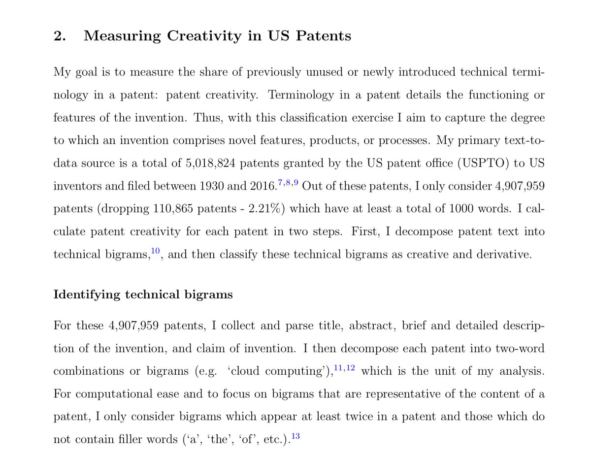 How can you tell creativity? Obviously, we cannot have RAs read all the patents, but we can use simple computational methods. Find all two word combinations, and discard those in common use before 1900. Those are technical bigrams. The less they’ve been used, the more creative.