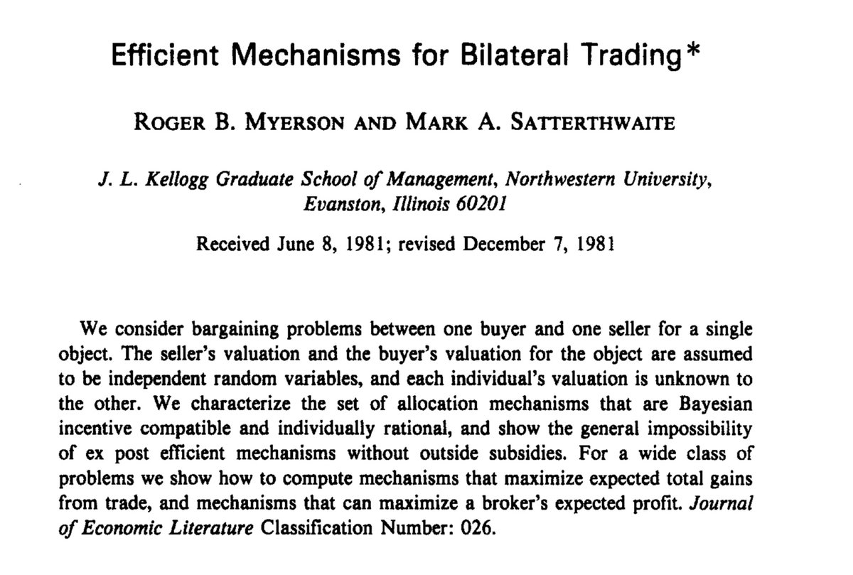 Suppose two parties, A and B, are to trade a good. There are a few desideratum we would like to have — we’d like participating to be individually rational, we’d like to have the person who values the good more have it, we’d like no subsidies, and we’d like incentive compatibility