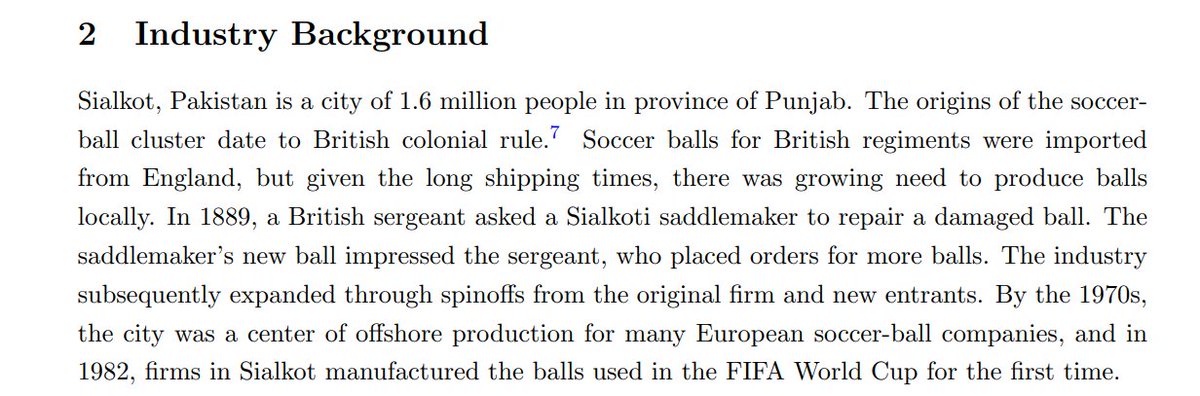 Sialkot, Pakistan, is one of the foremost centers of soccer ball production in the world, and it all started with a chance encounter between a British soldier and a saddlemaker. By 2012, 135 firms employed around 36,000 people to produce 20% of the world's soccer balls.