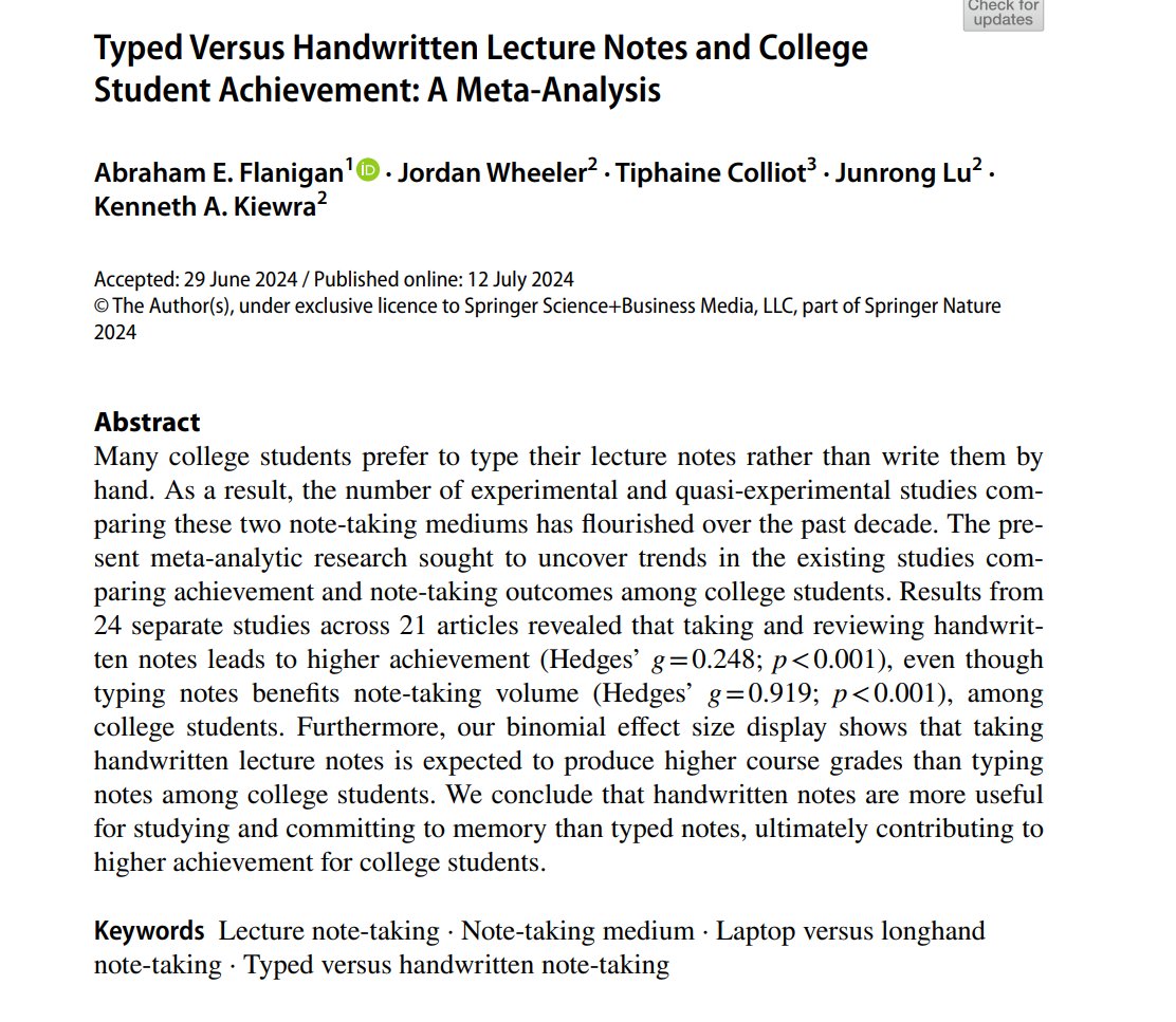 The meta-analysis she cites is quite annoyingly paywalled, but I did eventually get to read it. The studies they are analyzing are standard lab experiments on undergrads for notetaking. They have two groups, and have them answer a quiz after watching a 15 minute talk.