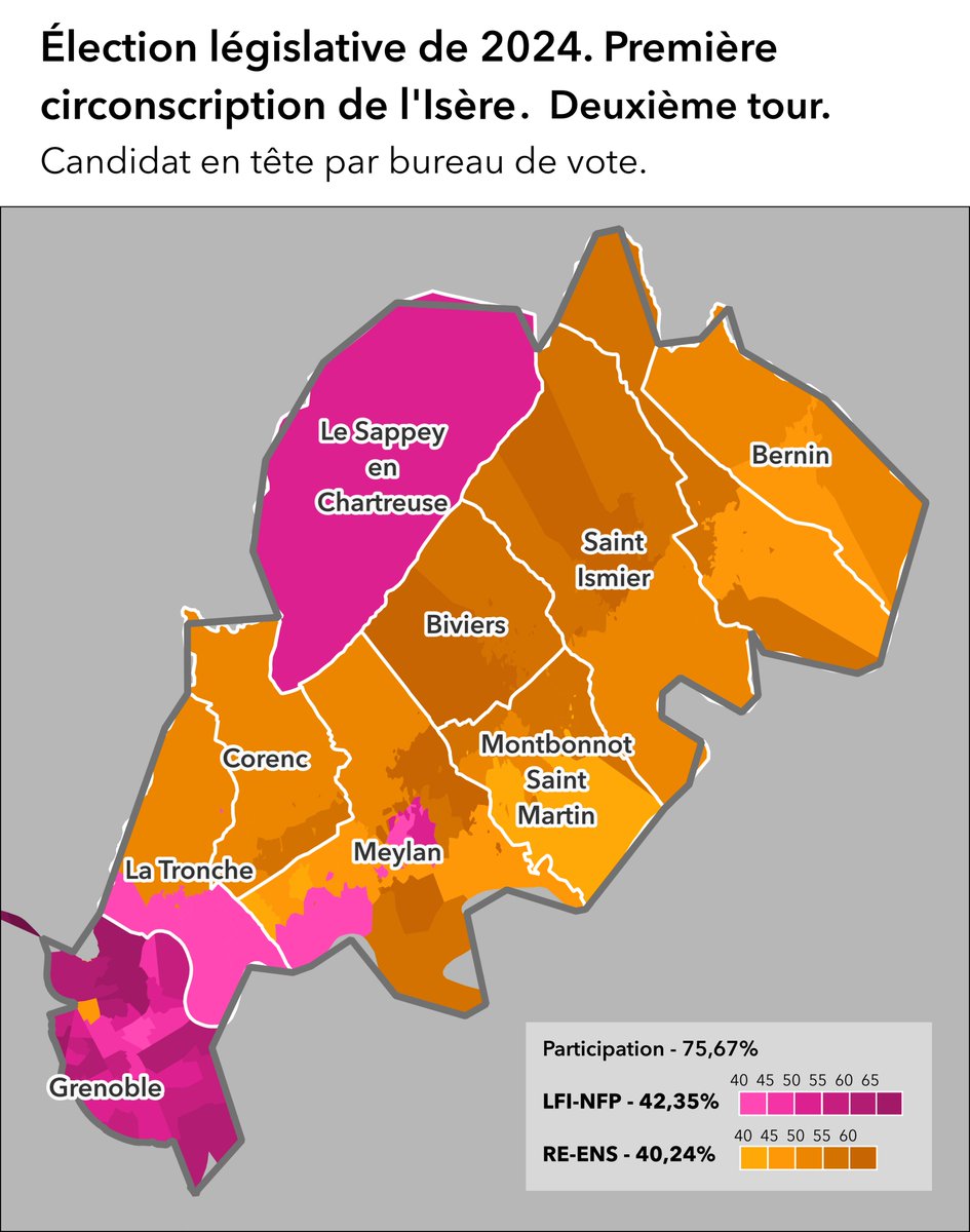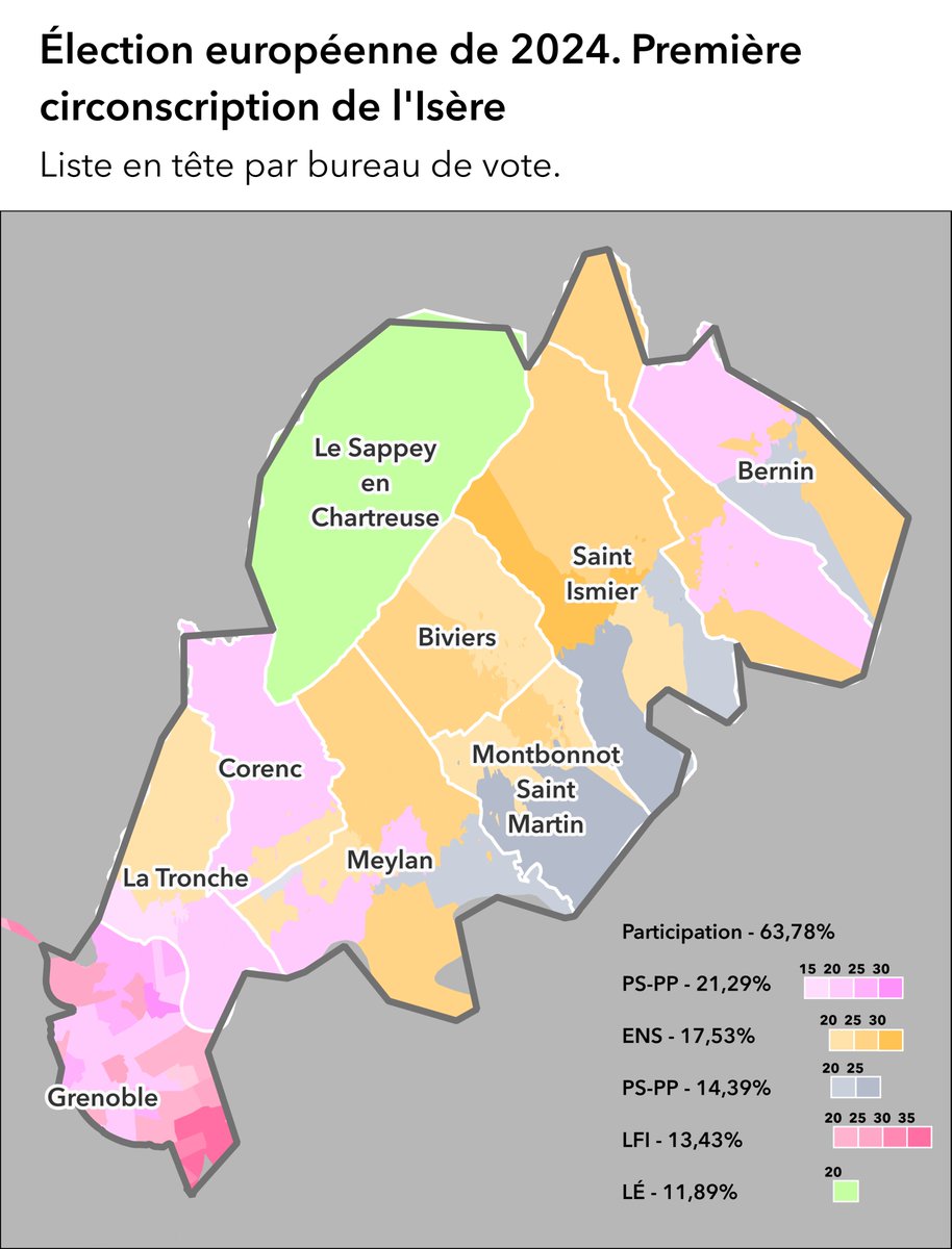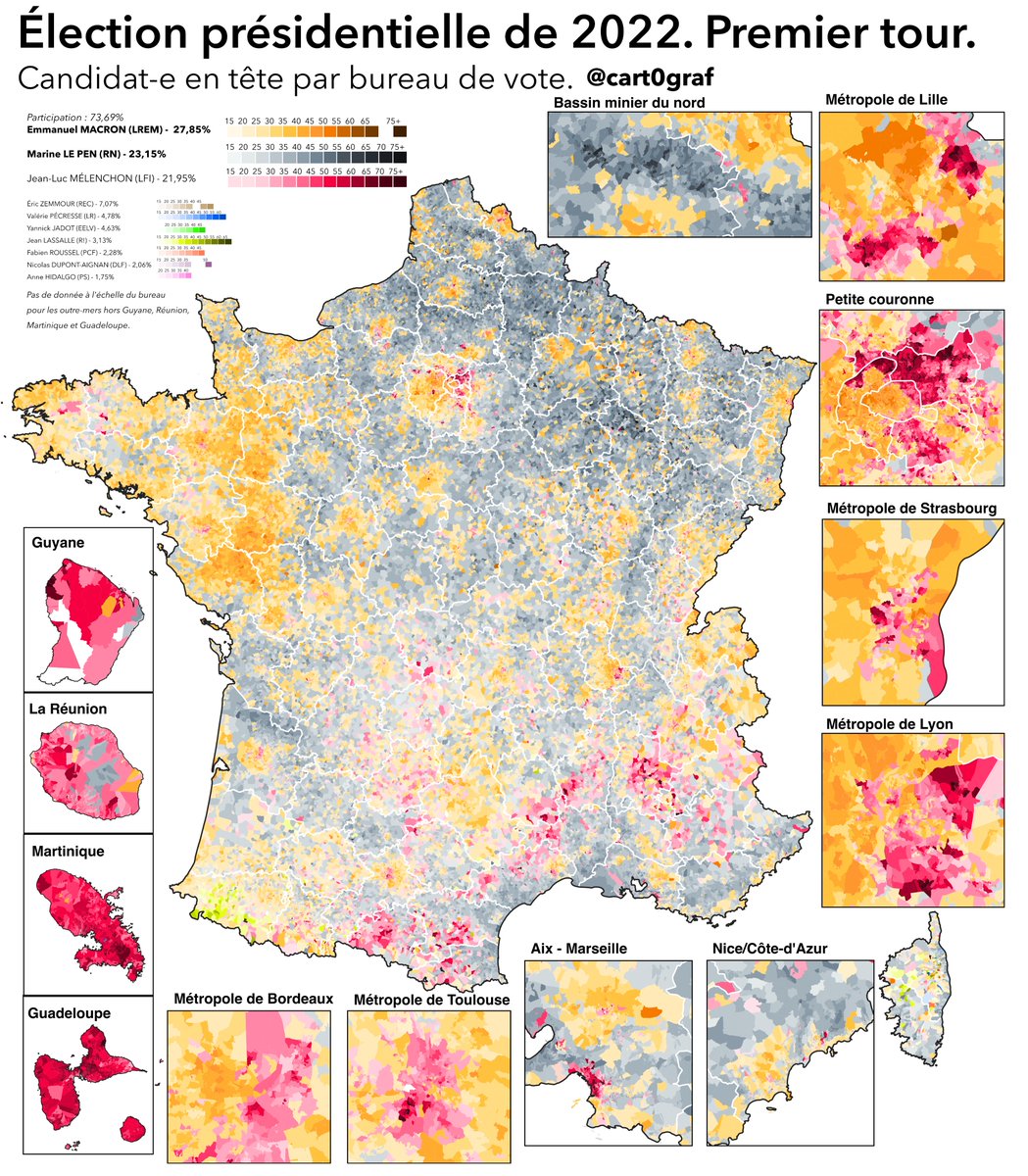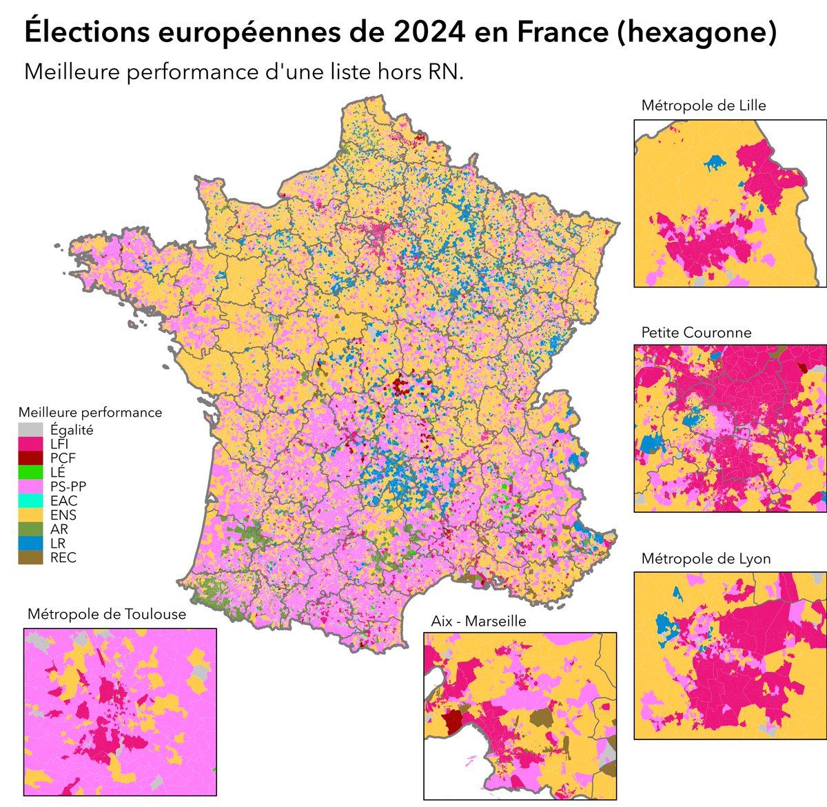 D'abord une remarque pour "bien lire" le thread : ce n'est pas une carte du score de chaque liste. Par exemple, il y a des communes bretonnes ou la liste RE arrive 3ème avec 20% (la liste Glucksmann fait 23% par ex.) et d'autres dans l'est rural où RE arrive deuxième avec 10%.