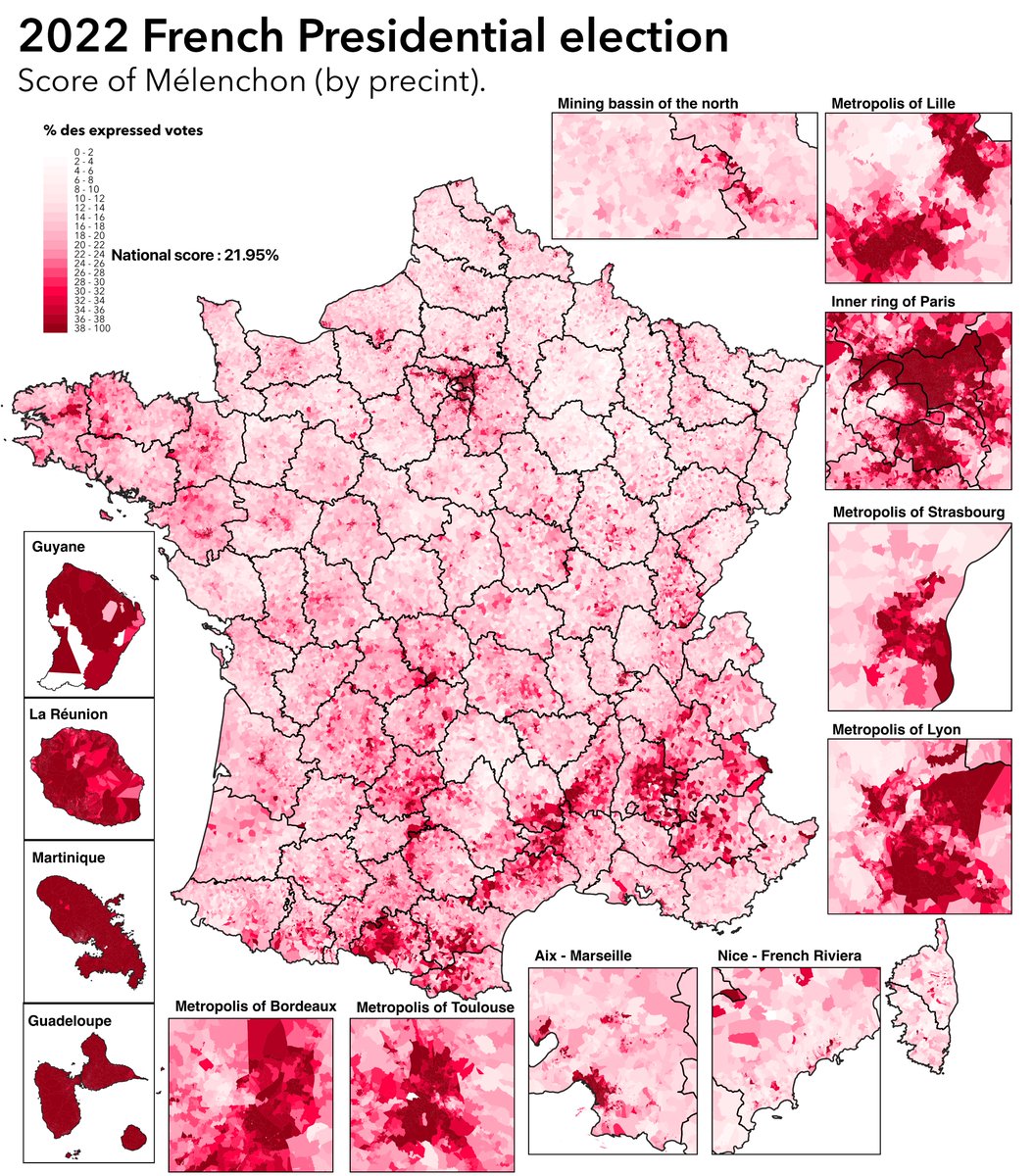 Les quartiers populaires se détachent très clairement sur la carte de son vote en exprimés : est de Paris, sud-est de Lyon, Marseille nord, Lille sud, Roubaix, Tourcoing mais aussi beaucoup de villes petites et moyennes pauvres. Ce serait moins le cas en inscrits (abstention++).
