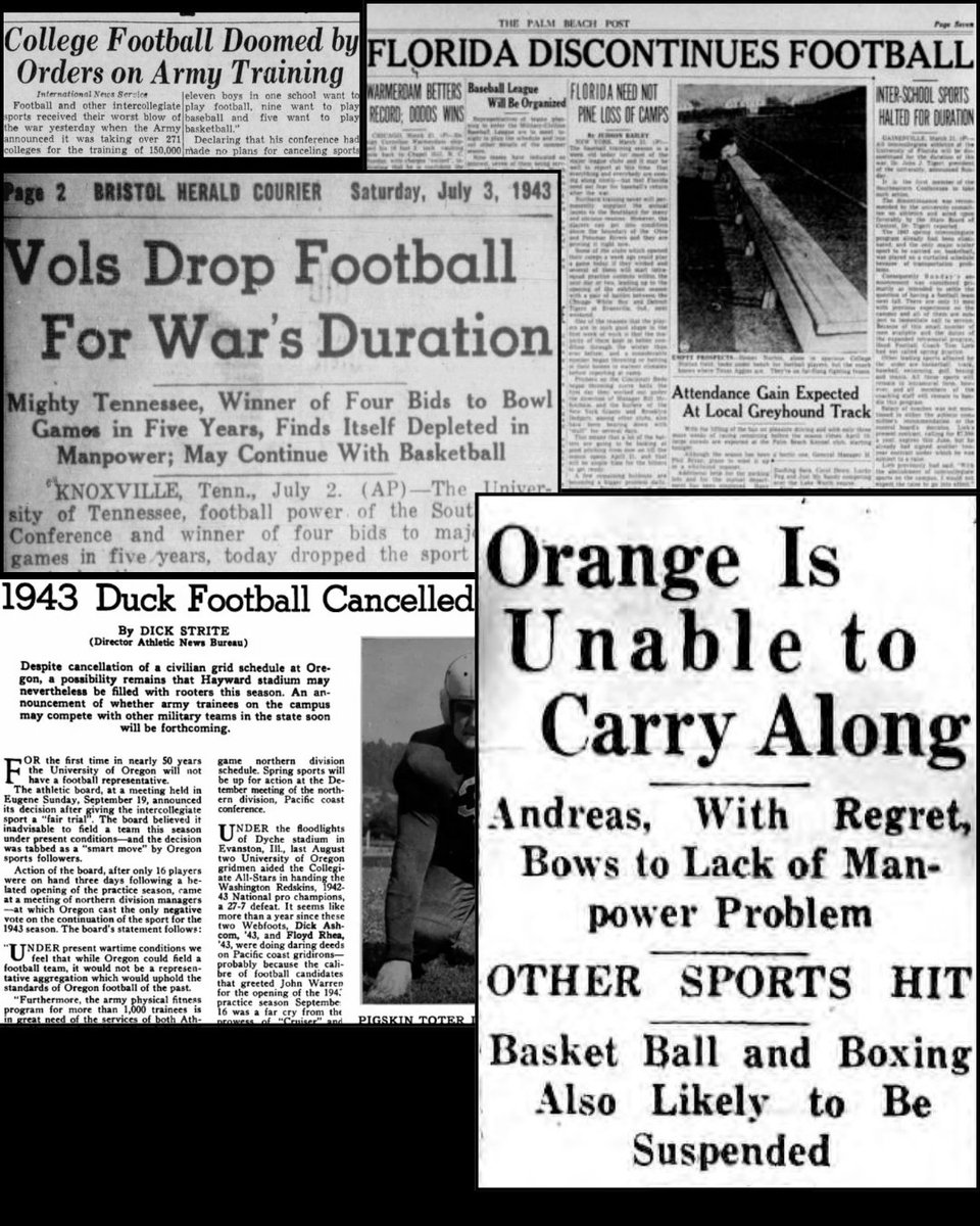 Following the United States' entry into World War II, many college football players were drafted or willingly enlisted in the war effort. As a result, rosters became depleted and several schools suspended their season.