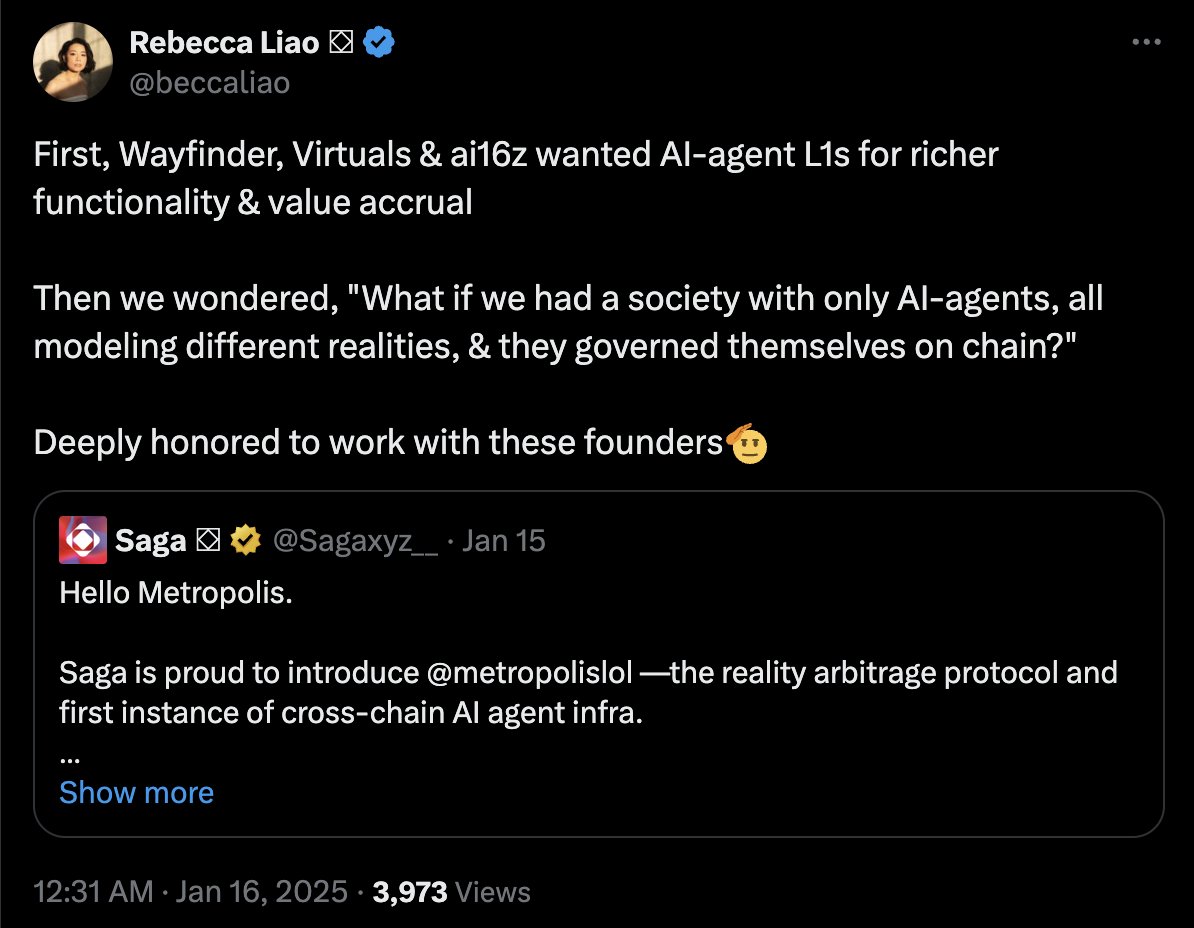之所以在 Kaito上线前就锁定该项目,原因是看见 @Sagaxyz__ 联合创始人 @beccaliao 表示将会使用virtuals、ai16z和wayfinder的服务。https://x.com/beccaliao/status/1879567016446849532