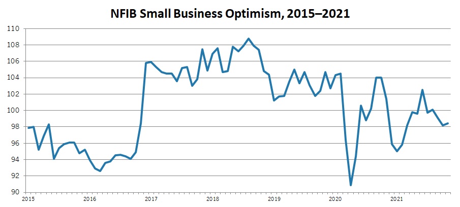 Small business owners remain challenged by supply chain disruptions, workforce shortages, inflation and COVID-19. The net percentage expecting better business conditions 6 months from now has plummeted from -33% in Sept. to -38% in Nov., the lowest level since November 2012.