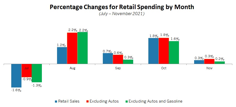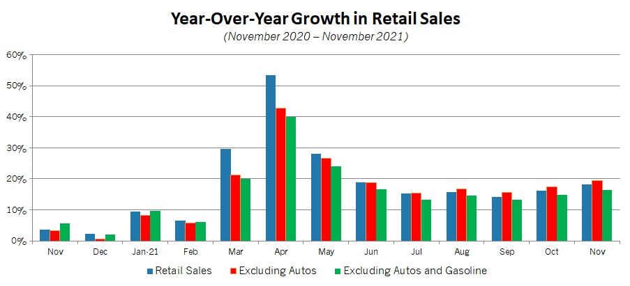 Yet, the data continue to reflect an American consumer that has opened their wallets over the past year as the economy has rebounded. Indeed, retail spending has soared 18.2% over the past 12 months, or 15.8% with gasoline stations and motor vehicle and parts sales excluded.