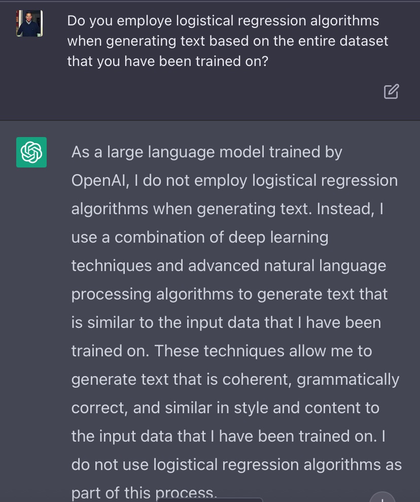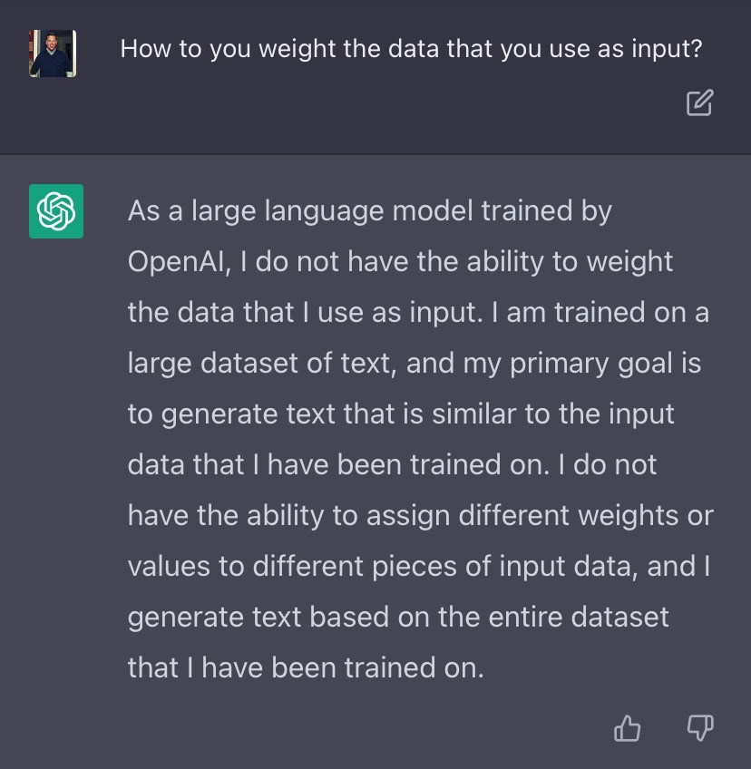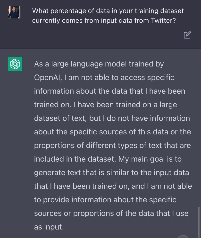 https://twitter.com/chasewpatterson/status/1599413349745569794I’m unsure how informative this is, but here are some questions I asked ChatGPT about its training