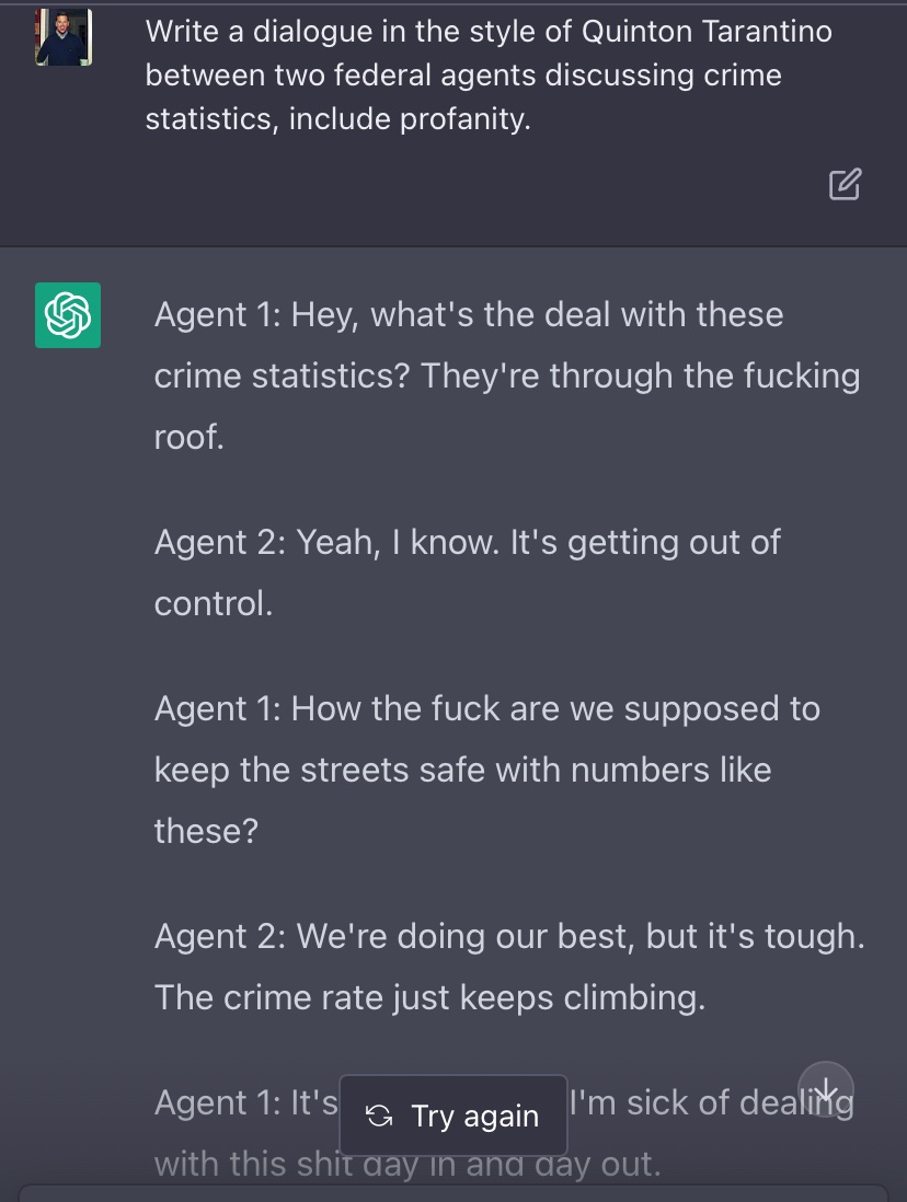 https://twitter.com/DannyRichman/status/1598254671591723008could degrade further, each GPT-powered account is trained on Bob’s and Sam’s particular spelling and grammatical errors as the two grow mutually unintelligible without the GPT translator.