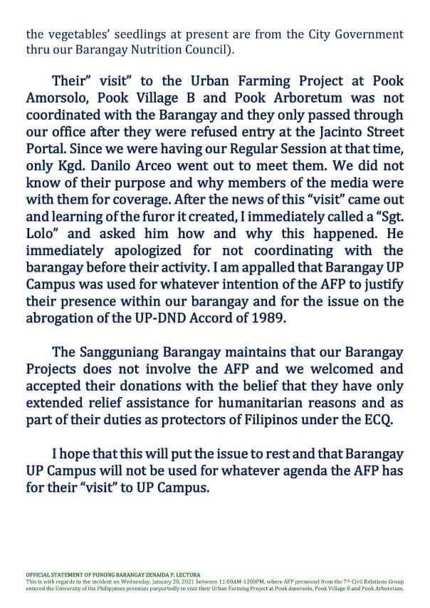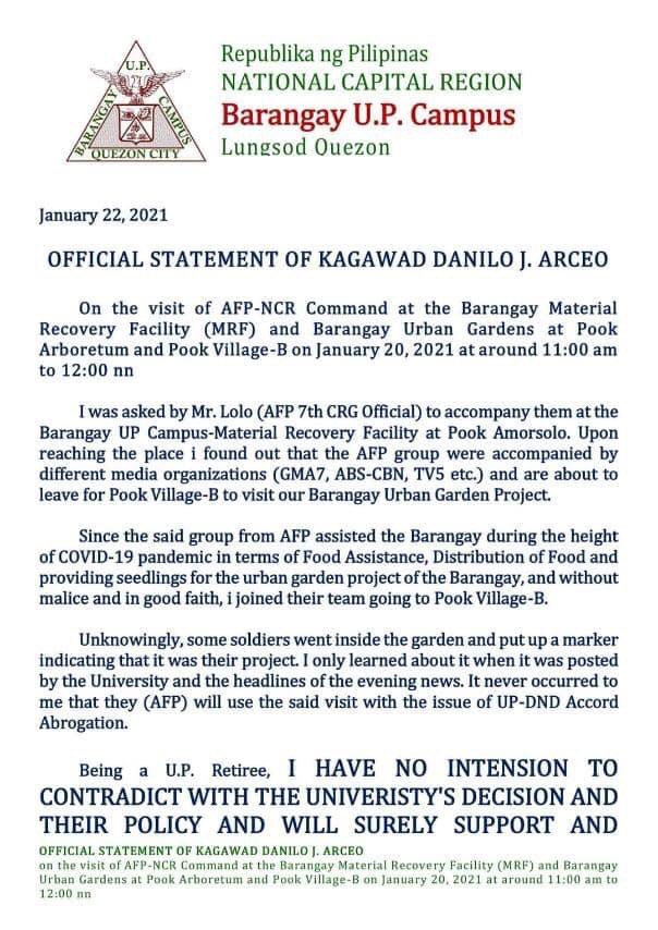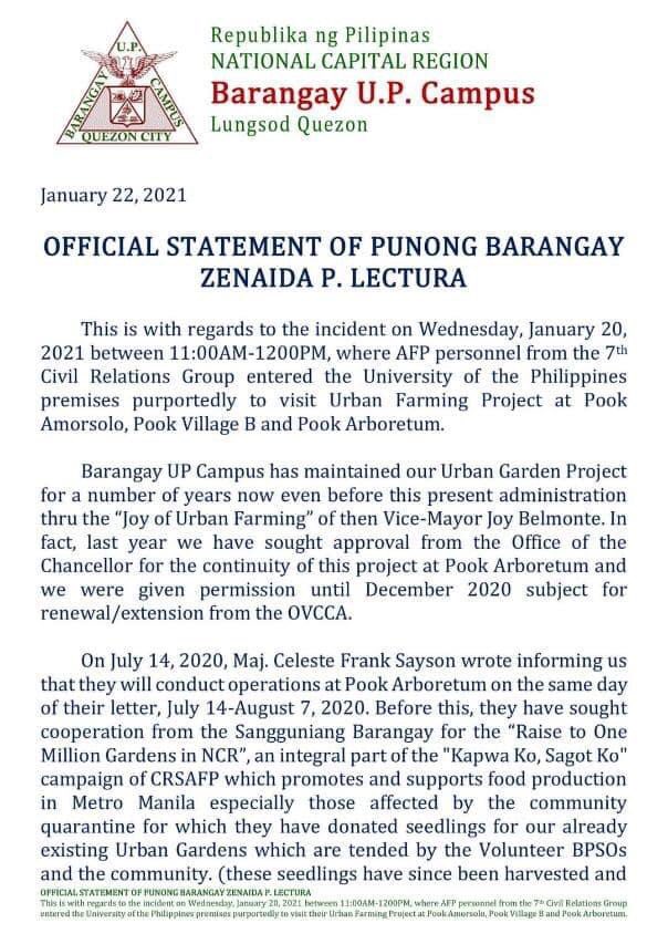 A problem has sprouted at the Brgy UP Campus urban gardening site, visited by AFP soldiers (7th Civil Relations Group) on Jan 20 to make a point about the abrogation of the UP-DND Accord. The AFP claimed the project was theirs. Now barangay officials are denying it. @ABSCBNNews