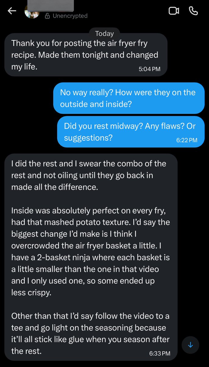 do u ever find when u make “air fryer fries” you’ll get a bitter burned tasting “crispy” exterior + a dried out interior not mashed potato like, almost nonexistent? The trick to fix is to rest fries halfway thru air frying for 10 min, then respray oil, fry at 400° to finish crisp