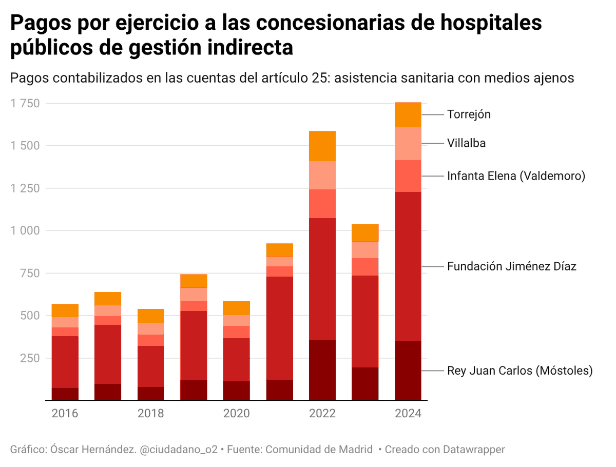 1/ En los últimos años, hemos centrado el seguimiento de los pagos realizados a Quirón y Ribera en las Cuentas Generales publicadas y, en concreto, en el Capítulo 2 ‘Gastos en bienes y servicios’ de la clasificación económica del presupuesto del SERMAS.