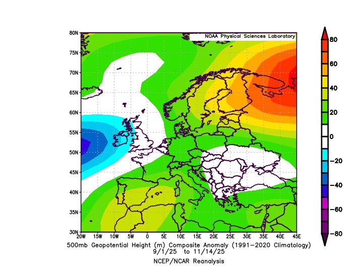 Dalla mappa relativa alle anomalie di T2m di sabato prossimo, possiamo notare come l'aria fredda si estenda verso il sud degli USA con T inferiori alla norma, mentre le T saranno superiori alla norma nel nord del Canada e in Alaska così come nella maggior parte dell'Europa. (2/6)