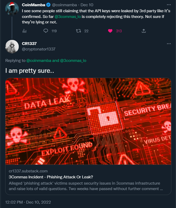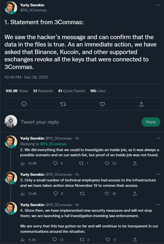 @YS_3Commas When I saw the first tweets from the victims I directly digged in; 'Was it not a phishing attack but a leak of API keys and possibly even an inside job?':