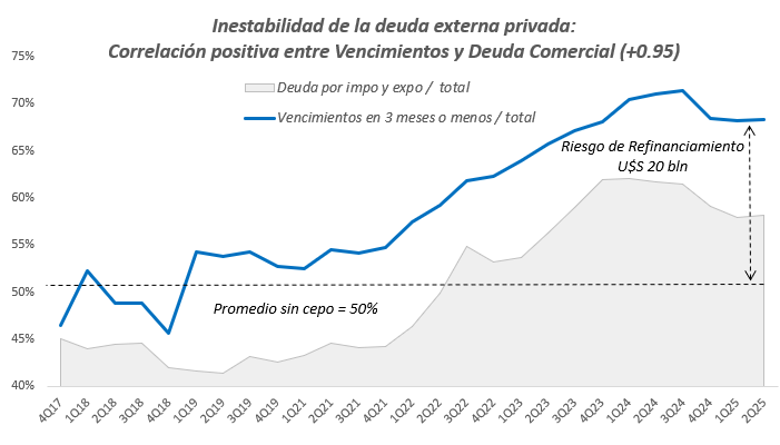 2.1/4 La figura muestra qué gran parte de la deuda externa privada vence en menos de 3 meses: hoy es el 70% de un stock total de más de US$ 100.000 M. Dos datos: 1) está fuertemente ligada a la deuda comercial (correlación del 95%), 2) está muy por encima de los niveles normales.