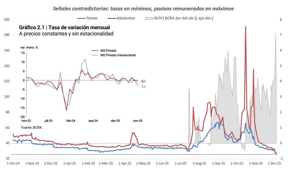 2.1/4 La figura muestra la TAMAR y la tasa de adelantos en cuenta corriente en mínimos. En el eje derecho, el repo del BCRA. Dentro del cuadro, el historial de variaciones mensuales reales y desestacionalizadas del M2 privado transaccional.