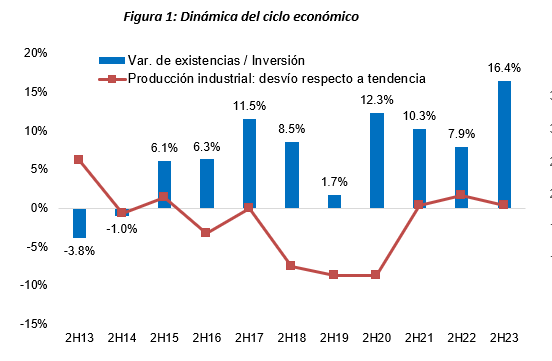 2.1/4 La figura 1 muestra que, al inicio de la recesión en 2H23, la acumulación de inventarios estaba en un máximo histórico. Esto implica no solo una recesión profunda y quizás más larga que el promedio, sino una baja demanda de importaciones devengadas. …