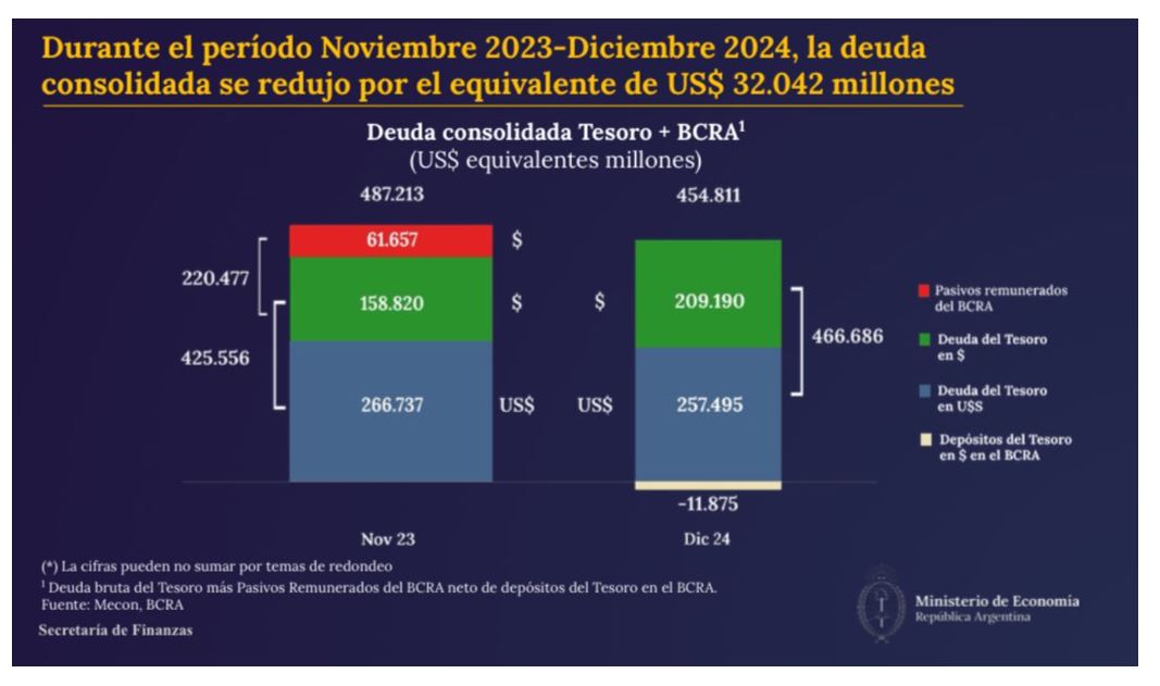 2.1/4 La figura muestra que un ajuste fiscal de 5 puntos redujo la deuda en igual magnitud. Nada sorprendente hasta que miramos en detalle. La deuda está expresada en dólares equivalentes, lo que (supongo) implica que está descontada la inflación en dólares.