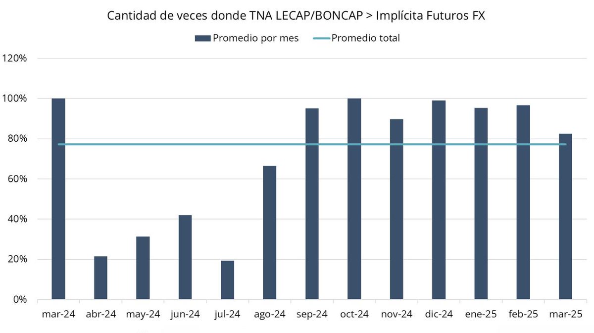 2.1/4 La primera figura muestra el porcentaje de ruedas y plazos en los que la tasa de LECAP estuvo por encima de la tasa implícita de futuros. La segunda figura presenta la tasa real que surge de la tasa de política monetaria vs. inflación esperada.