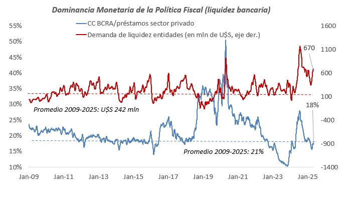 2.1/4 En abril la base monetaria creció casi 10% real sin estacionalidad, máximo desde julio-24. Seis de esos diez puntos son depósitos de las entidades en la CC del BCRA, que se utilizan para integrar los requisitos de liquidez. La figura muestra que en abril el cociente …