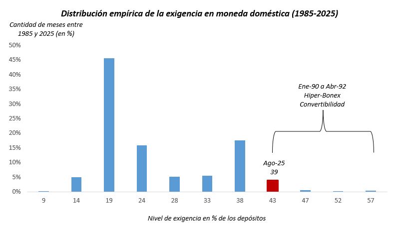 2.1/4 La figura arriba muestra la distribución empírica de la exigencia en moneda doméstica sobre las entidades financieras entre 1985 y 2025, 40 años (480 meses). Los encajes normativos. En el eje horizontal los niveles de exigencia en porcentaje.
