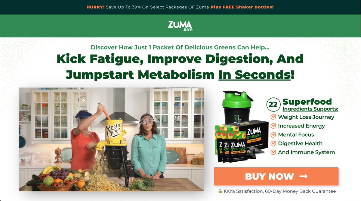 Zuma Juice uses a solution-aware headline highlighting the product's 3 main benefits.