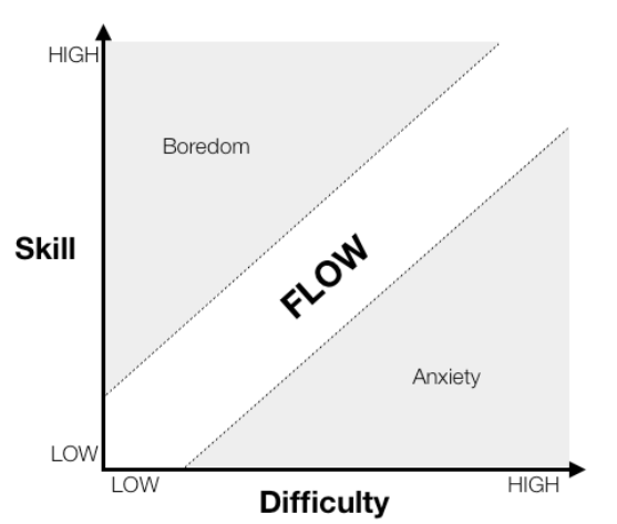 So in case you haven't seen this before, this chart describes the "cognitive flow" by Mihaly Csikszentmihalyi, and it states that the skill of a person and the difficulty of a task correlate with each other creating a certain range of emotions (boredom, flow, and anxiety)