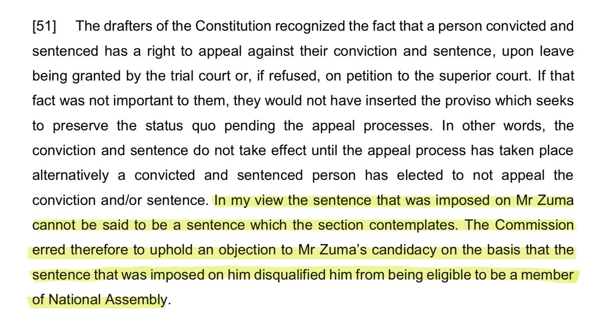 🧵I’ll keep my ting brief. Zondi JA rejects all of MK’s arguments and I mean *all*. But somehow towards the end reasons that s 47(1)(e) doesn’t apply to Zuma because the sentence could not be appealed. This means that only sentences imposed by the High Court or upheld/reinstated