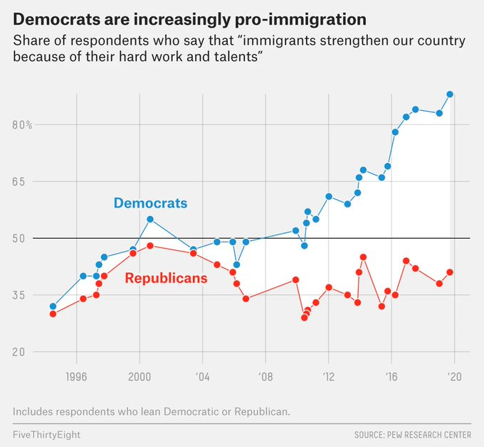https://twitter.com/Cavalewis/status/1520095372949049346Prior to 2010, Democrats were deeply ambivalent about immigrants and immigration. For example, in 2010, less than half of Democrats believed that immigrants "strengthen our country." Today, endorsement of this idea is universal within the Democratic Party.