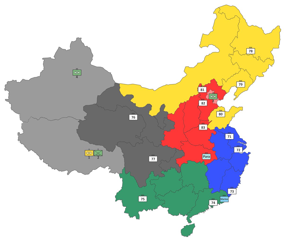צבא היבשה הסיני, יקרא החל מפה "הצבא", מחולק לחמישה פיקודים גאוגרפיים מרכזיים, צפון [צהוב], דרום [ירוק], מזרח [כחול], מערב [אפור] ומרכז [אדום].