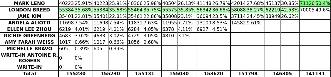 Many also saw the later updates, late last night and today, with Leno winning. As of this afternoon (Preliminary Report 5), Mark Leno is barely ahead, thanks to RCV. (The election is still wide open, since there are a ton of vote-by-mail ballots still to be counted.)