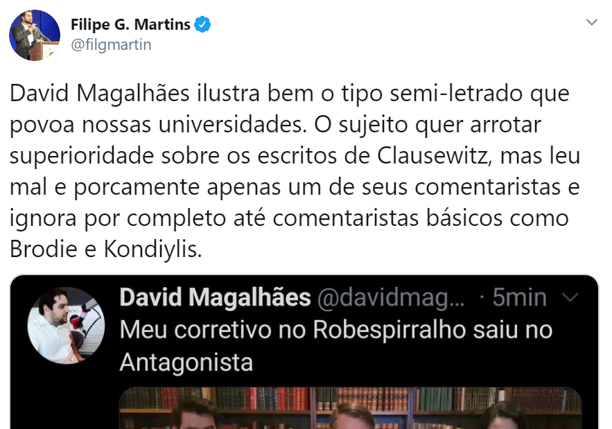 https://twitter.com/filgmartin/status/1272358716390727680Mas é uma confusão conveniente. A visão da política como guerra, que traz consigo a possibilidade da aniquilação do outro (p/ Schmitt, o inimigo) está no DNA do fascismo e, por consequência, do bolsonarismo, que só existe se houver um inimigo para destruir.