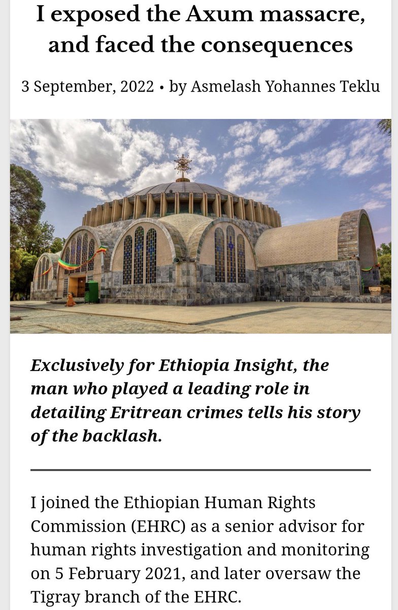 Long THREAD: Asmelash Yohannes Teklu (AYT), Tigrayan author of fake Axum massacre, wrote his story on Ethiopia Insight. Timing is predictable. But contrary 2 z author’s goal, its many holes reflect z web of lies TPLF weaves. Asmelash later oversaw z Tigray branch of z EHRC. 1/n