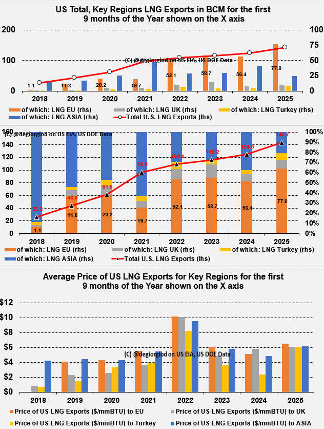 Dagli Stati Uniti (e *non* vuol dire che i venditori siano gli USA, ovviamente) son partiti 77miliardi di metri cubi di LNG per l'Europa, oltre il 60% dell'ammontare record (~144bcm) esportato nei primi 9 mesi del 2025.