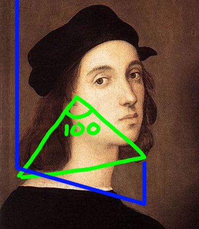 Similar to The Golden ratio “Geometric Tenting” is an informed principle in which we balance out medial and lateral space with regards to the internal composition’s Primus Angelius. It’s sometimes called the Bronze Ratio, and known in The UK as “Brown Lining”. (Blue line in pic)