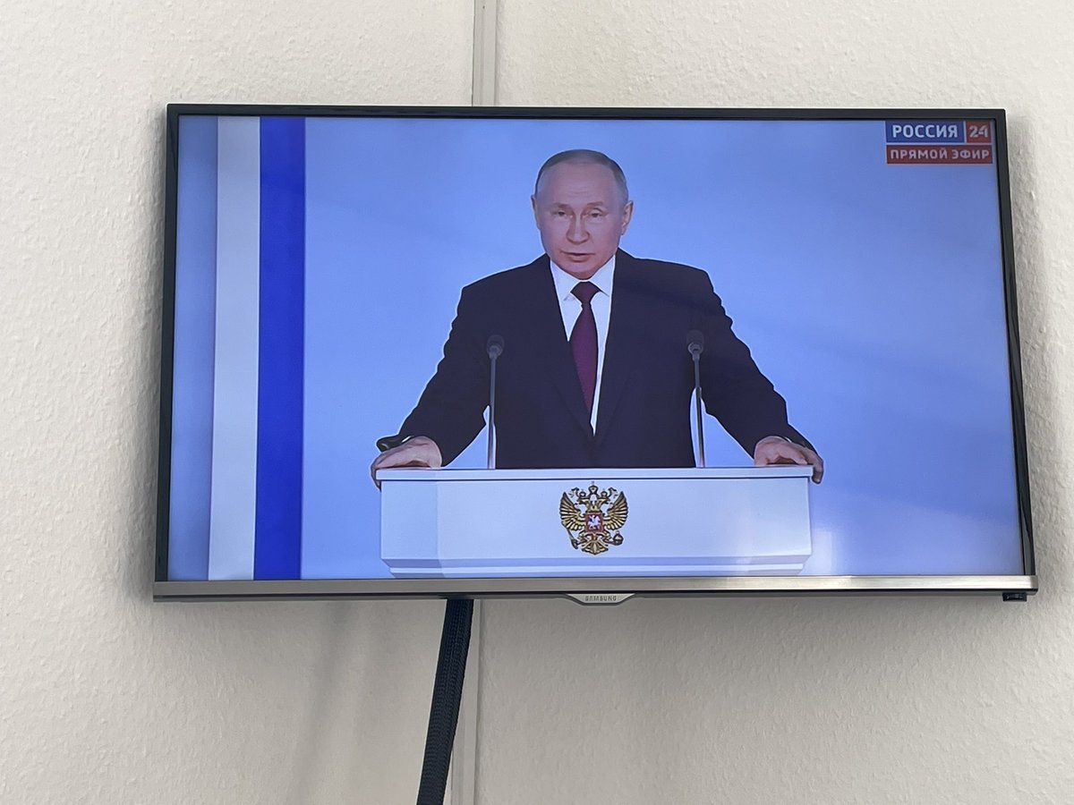 https://twitter.com/demianvonosten/status/1627935709762924544Putin beginnt erstaunlich pünktlich, nur fünf Minuten Verspätung. Es seien "schwierige Zeiten" für Russland in Zeiten "kardinaler Veränderungen" der Welt. Er geht direkt ins Thema.