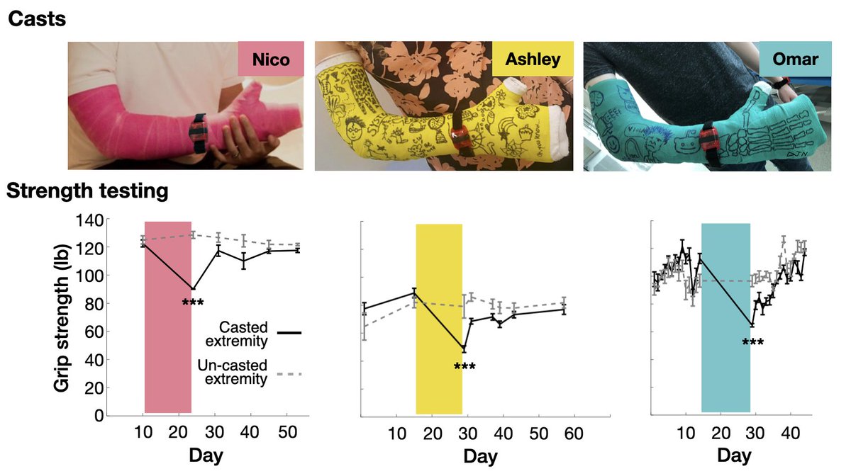 (thread below) @ndosenbach, @hashtagAshleyN and one other crazy neuroscientist wore casts on their dominant arms for two weeks. They all lost ~40 lb of grip strength