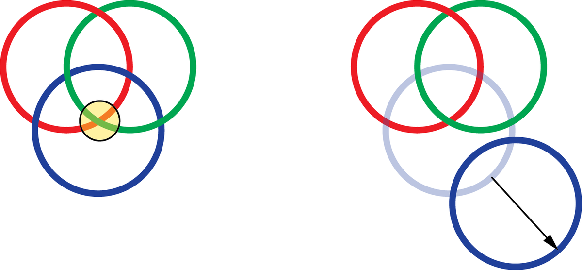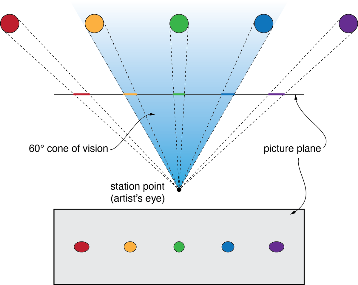 from above. The "picture plane" is the artist's canvas, the "station point" is the artist's eye, and on the other side of the canvas are five spheres of equal size that are hovering at the artist's eye level. One might think the spheres will appear as circles on the canvas, 2/7
