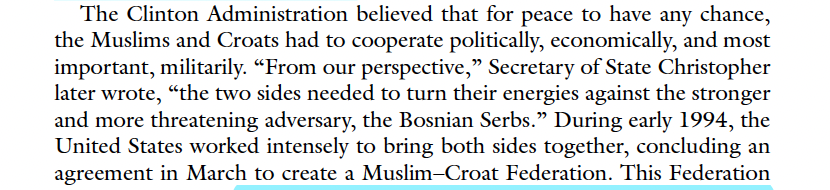 https://twitter.com/JasminMuj/status/15494576875863040001. First bit of context necessary is the 1994 Washington Agreement. Here the US, at considerable trouble, forced a union between Bosniaks and Bosnian-Croats. Then a US negotiator for Clinton, @derekchollet in his seminal study of the Dayton Accords stresses the significance: