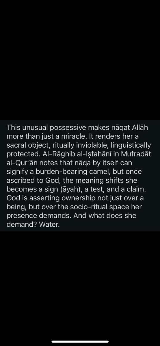 The Qurâan does not merely say nÄqa (âcamelâ). It says nÄqat AllÄh âGodâs camelâ (7:73, 11:64, 26:155, 91:13). This divine possession is unusual. The only consistent parallel is Bayt AllÄh, the KaĘżbah. (2/9)