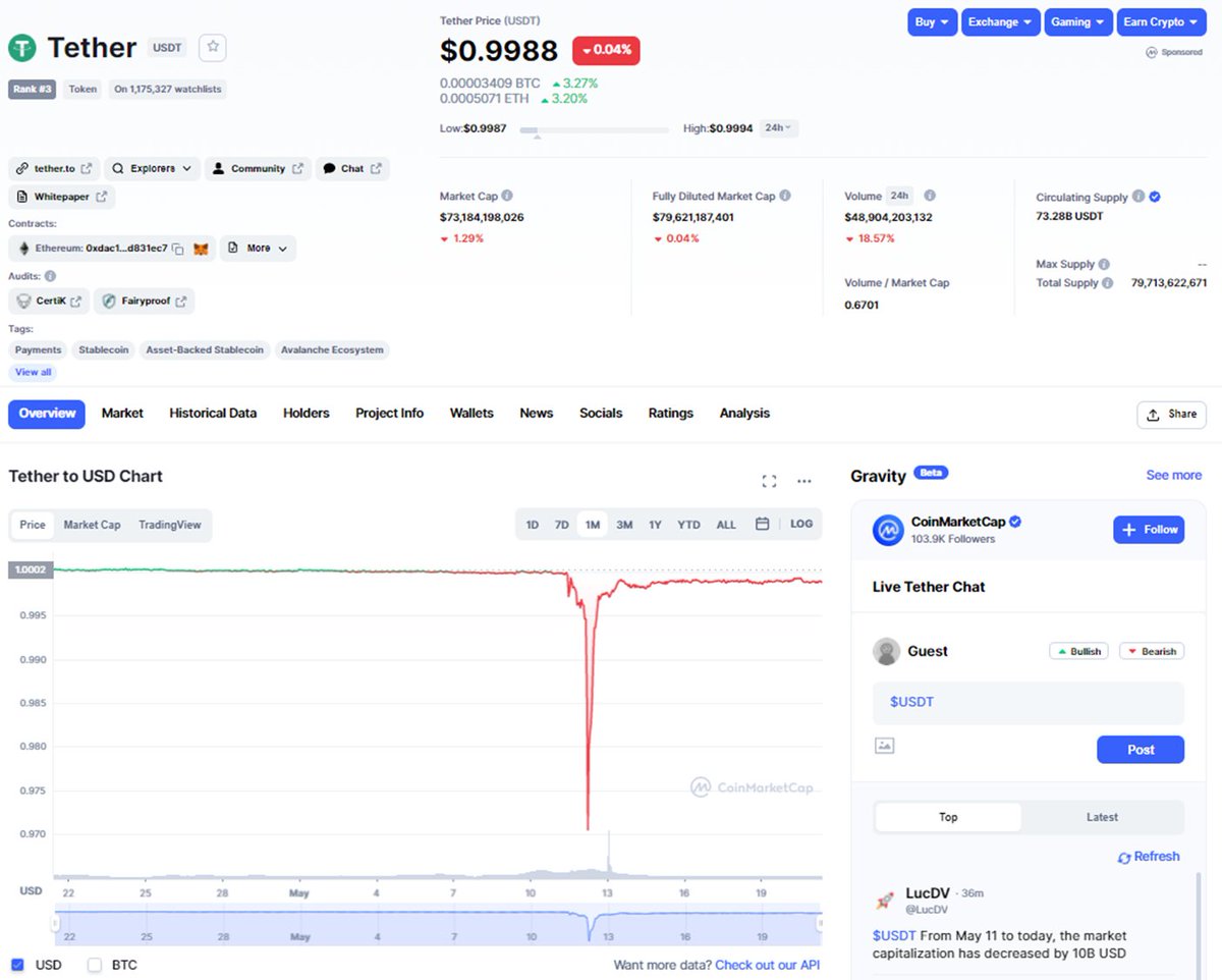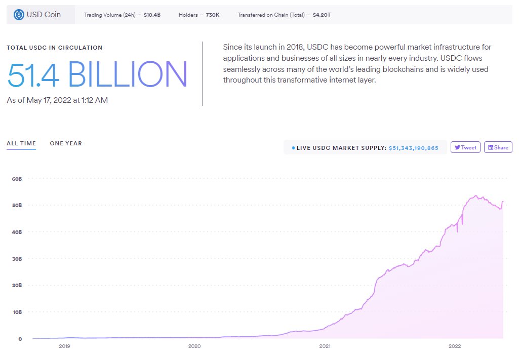 https://twitter.com/domidom88/status/1526008516334350336?s=20&t=p_SP-nJ8PGcDBcYTq5fN2w$USDC は、米国のCircle社が発行し交換を担保する。現在Tether社発行の $USDT に次ぐ2位のステーブルコインである。