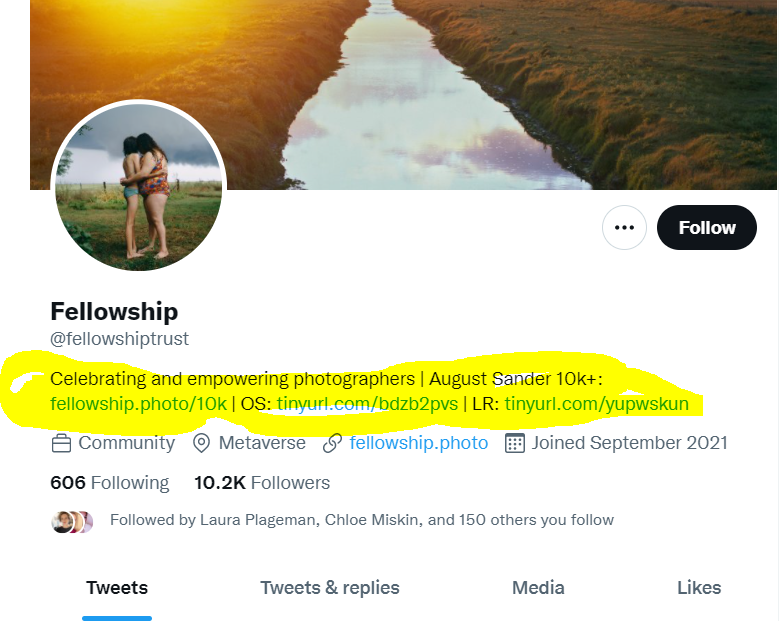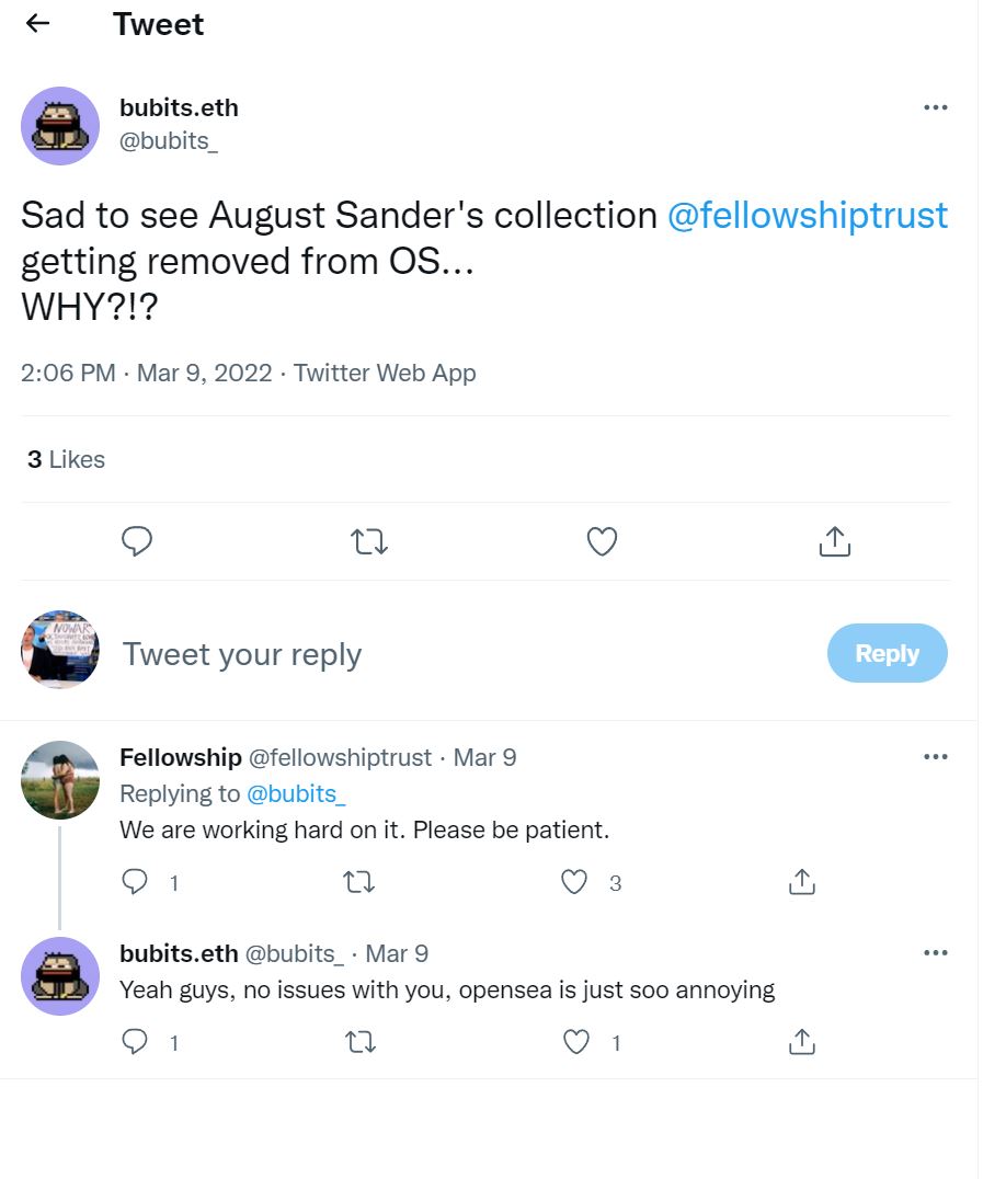 https://twitter.com/eyeshutterunot/status/1504283234217054208Ten days after the images were removed from Opensea @fellowshiptrust still are promoting the 10k August Sander drop on their twitter header ... leading to 'This Page Is Lost'.