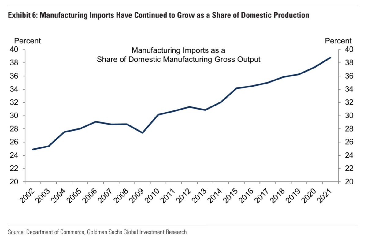 As you can see in the previous chart, US companies used to re-invest a LOT more into capex & R&D (>65% in the early 1980’s)! Something big happened post 2000: there was a huge drop in re-investment, which coincided with a shift of manufacturing to China & elsewhere. Good or bad?