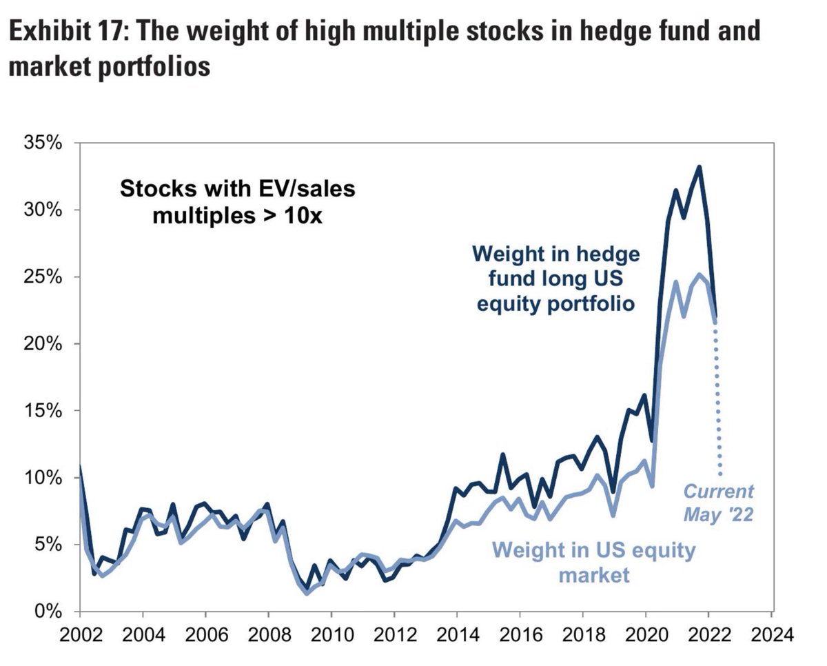 Despite the tech selloff, the weight of high multiple stocks (>10 EV/Sales) in both the indices and hedge fund portfolios is still extremely high compared to recent history, although HF’s are now inline with the index. Still >22% weight, vs ~3% for a few years post the GFC.