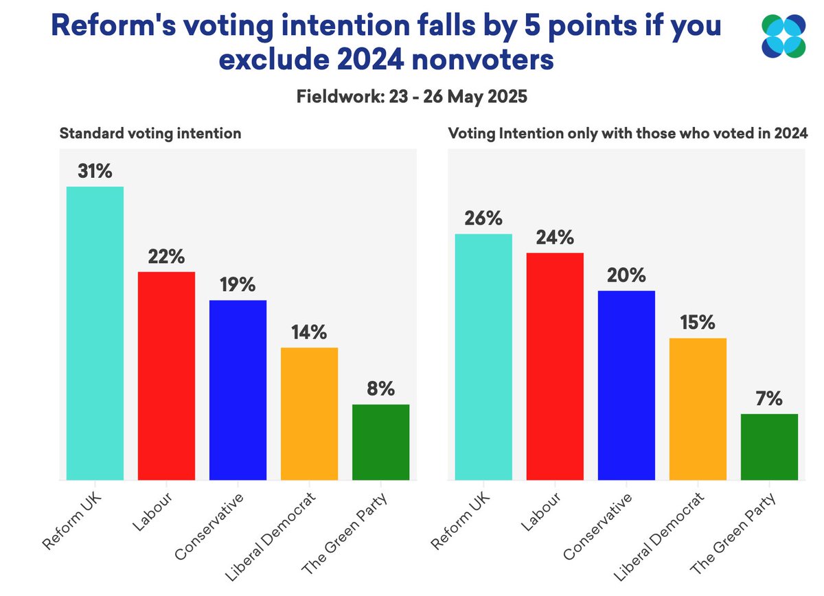 2024 nonvoters are having a big impact on voting intention polls at the moment - if we remove all of them from our headline voting intention, Reform's vote share falls from 31% to 26%, significantly shrinking their lead over Labour